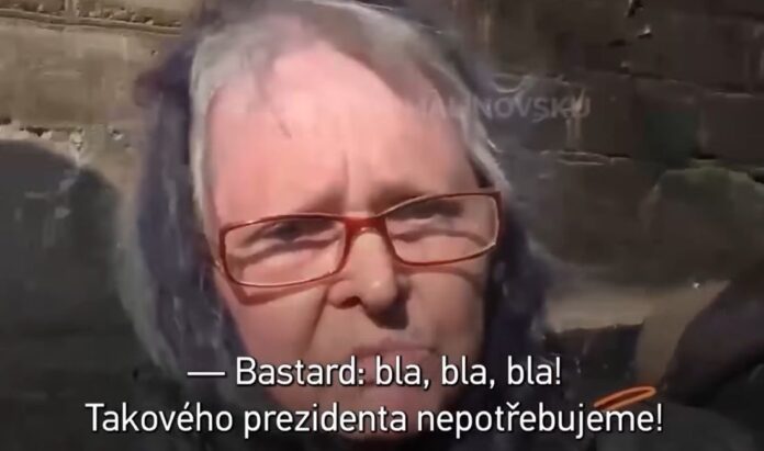 „Kedy už Zelenskyj odloží svoj kufrík a vypadne odtiaľto do čerta. Kretén!“ pridáva sa ďalšia z babiek. „Odkážte celému svetu, že sa nám vysmieva. Ukážte im naše domy. Nie je to vláda! Zelenskyj svoju stranu nazval Služobníkom ľudu. Čím slúžiš? Čím slúžite ľuďom? Čím?!“ pýta sa staršia Ukrajinka a dodáva: „Basatard! Bla, bla, bla! Takého prezidenta nepotrebujeme!“